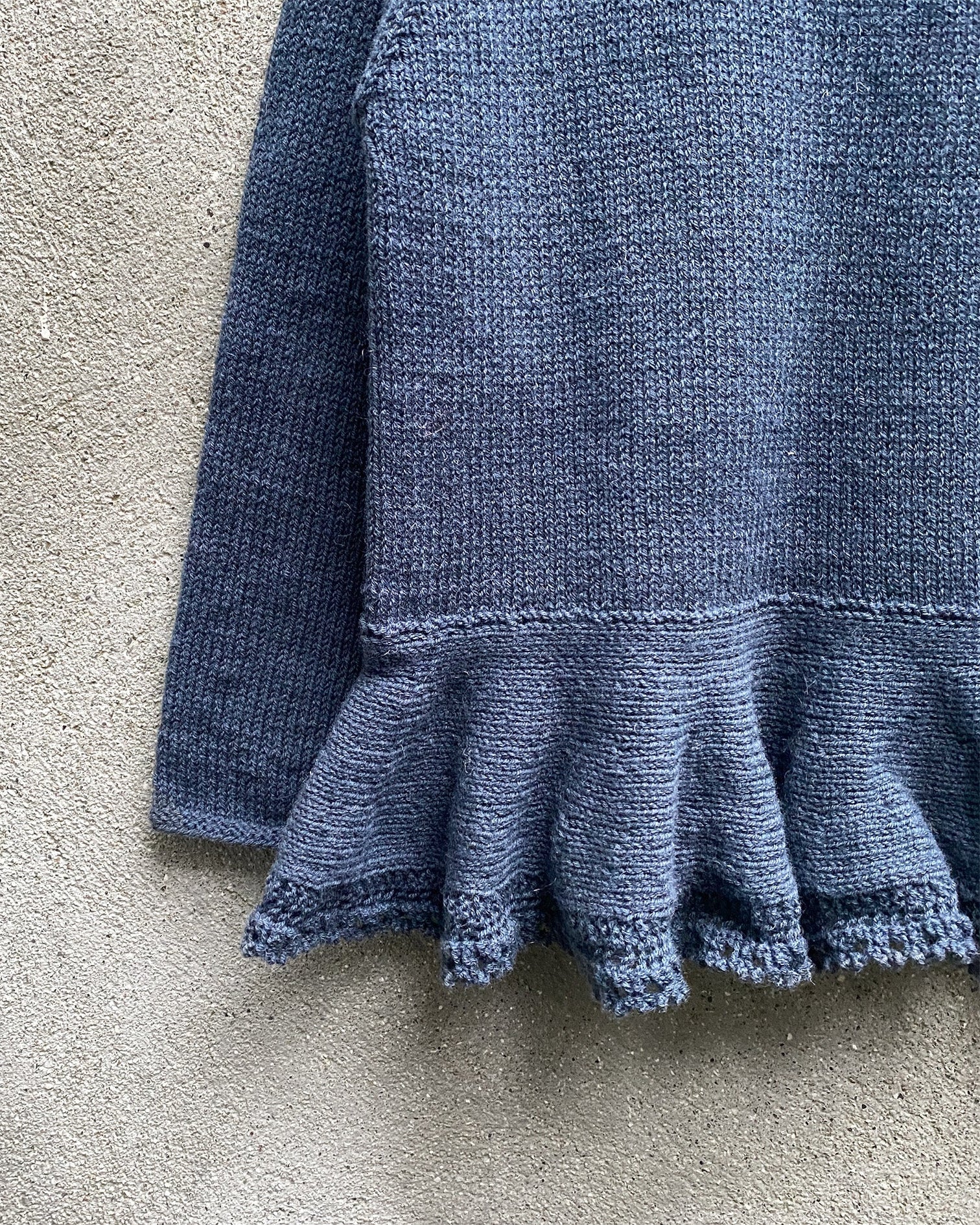 Agnes Blouse is a loose-fitting blouse with a decorative ruffle along the bottom edge. The blouse is worked from the bottom up using 1 strand of Merino. You start by casting on for the ruffle using provisional cast-on method and work the ruffle sideways using German short rows. Afterwards, the ruffle edges are grafted, stitches for the body are picked up and the body worked in stockinette stitch in the round to the underarms. Sleeves are worked in the round in stockinette stitch from the bottom up, and body and sleeves are then joined on one needle and the yoke shaped with raglan decreases. There is a small keyhole opening at back neck that is closed with a button.