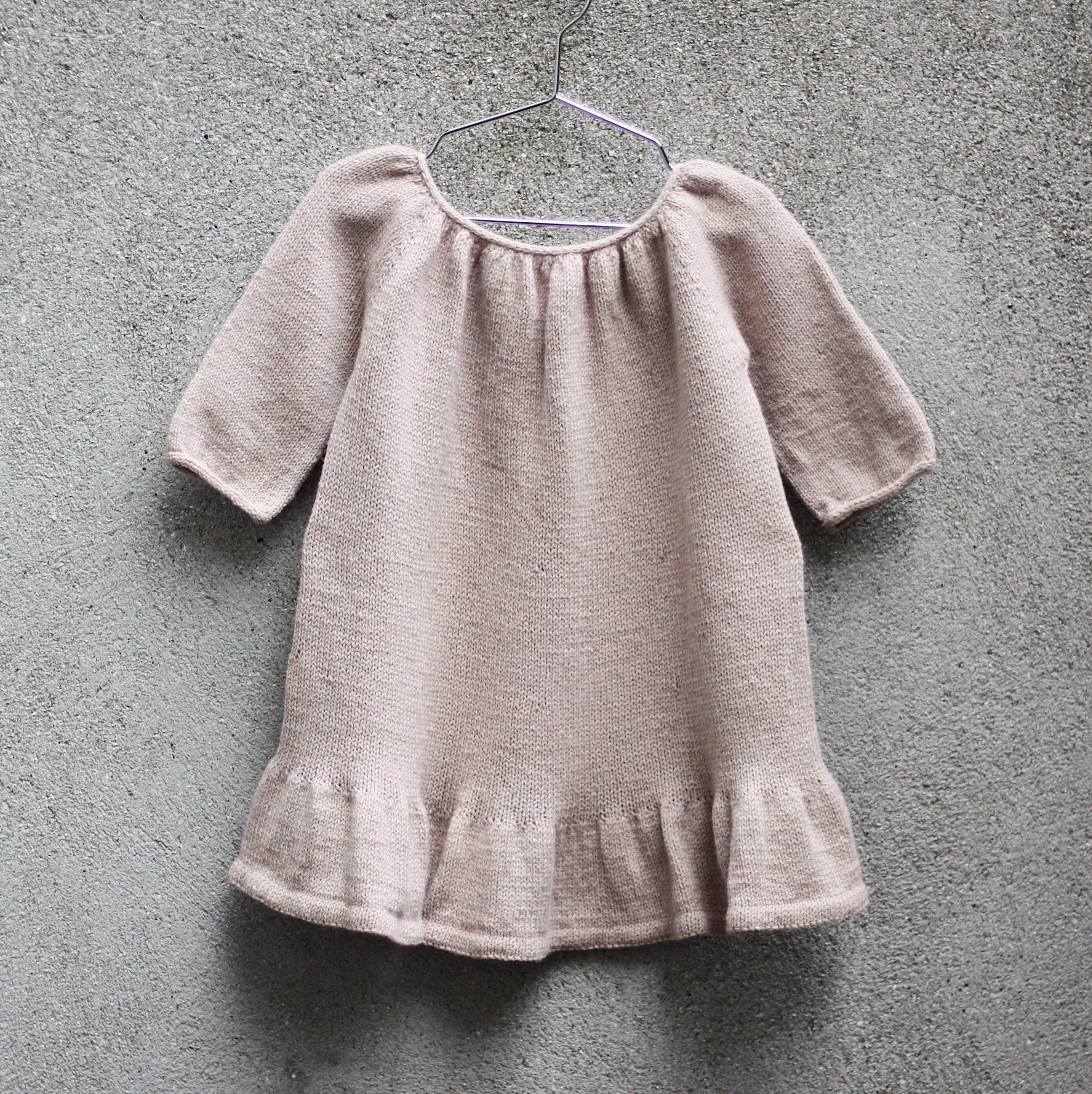 Augusta Dress is a simple dress in stockinette stitch with 3/4 length sleeves, a gathered yoke and a ruffle along the bottom edge. The dress’ loose fit provides the child with enough room to play and move. It is worked seamlessly from the top down using 1 strand of Merino, Cotton Merino or Pure Silk.