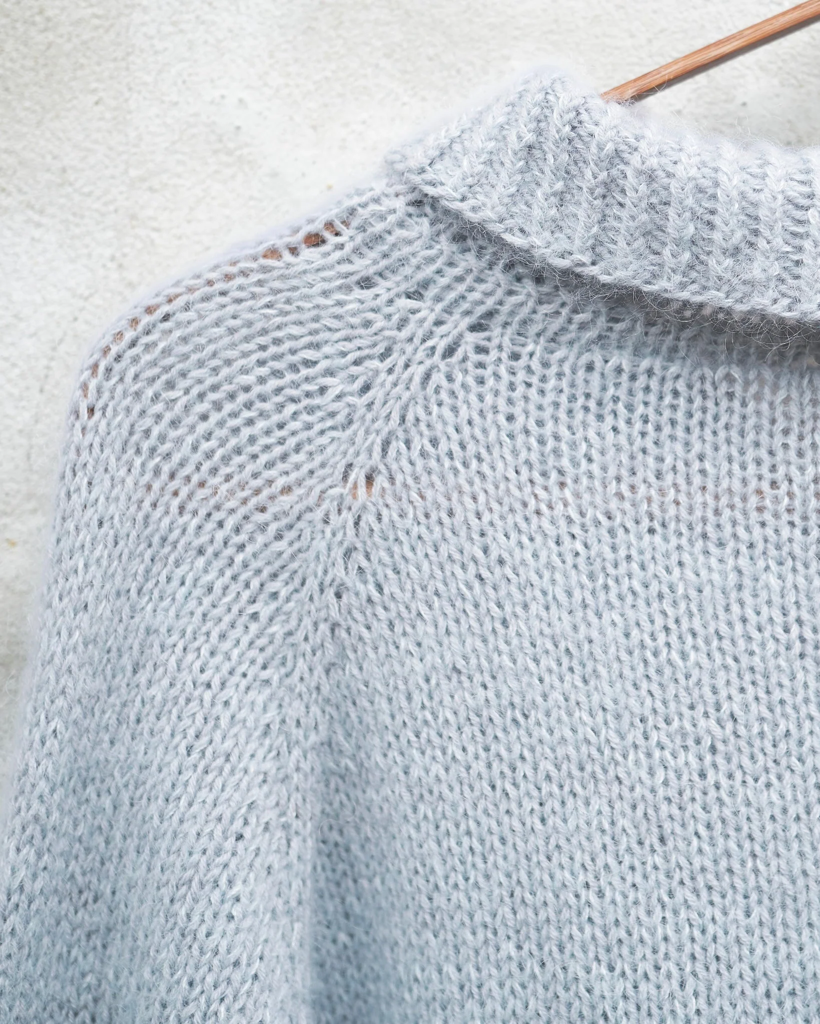Yarn: 1 strand of Knitting for Olive Merino (250 m [273 yd] / 50 g [1.8 oz]), fingering-weight yarn, 4 (4, 5, 5, 6, 6, 6, 7, 7) balls + 1 strand of Knitting for Olive Soft Silk Mohair (225 m [246 yd] / 25 g [0.9 oz]), lace-weight yarn, 4 (5, 5, 5, 6, 6, 7, 7, 8) balls. Sample is in Merino in Soft Blue colorway + Soft Silk Mohair in Ice Blue colorway